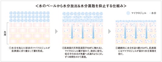 肌に触れると、ジェルから液状に変化し、肌の表面に形成する水のベールから点滴のように、継続的に水分を送ります。同時に肌表面には高分子の水のベールが留まり、水分の蒸散も防いで、潤いをキープ。