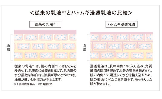 ハトムギ浸透乳液と、一般的な乳液との違いは、潤いを閉じ込める方法です。一般的な乳液は肌の表面に形成した油膜に頼って水分の蒸散を防ぐため、保湿力を重視して塗布量を多くするとべたつきやすく、メイクの妨げに。