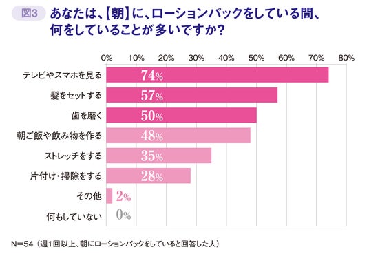 朝にローションパックを行っている間にしていることは、1位「テレビやスマホを見る(74%)」、2位「髪をセットする(57%)」、3位「歯を磨く(50%)」。「特に何もしていない」と回答した人は1人もおらず、忙しい朝でも時間を効率よく使い、“ながら美容”でローションパックをしていることが明らかになりました。【図3】