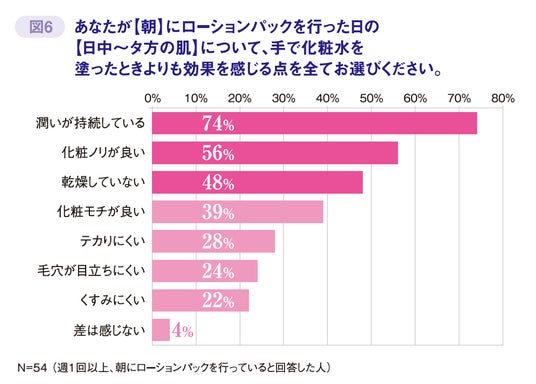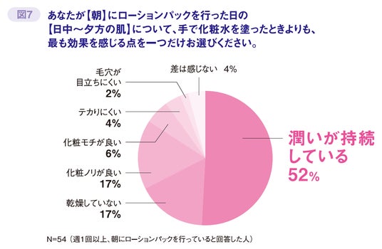さらに、朝にローションパックを行った日の日中から夕方の肌についても聞いてみると、手で化粧水を塗布した時の効果と比較して、1位「潤いが持続している(74%)」、2位「化粧ノリが良い(56%)」、3位「乾燥していない(48%)」で、最も効果を感じるのは、「潤いが持続している」(52%)でした。【図6】ローションパックは即時的な効果だけでなく、持続的な効果もあることが分かりました。【図7】