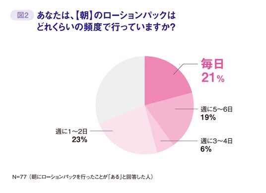朝にローションパックをしたことがあると回答した人のうち、約7割が1週間に1回以上、朝にローションパックをしており、朝のルーティンとなっていることも分かりました。中には、毎日行っていると回答した美意識が高い人も。【図2】