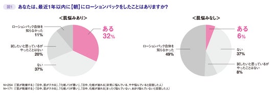 肌の乾燥やテカリ、化粧ノリ、化粧崩れに悩んでいる人に、朝にローションパックをしたことがあるかを聞いたところ、「ある」と回答した人は3割(32%)。これは、それらの肌悩みがないと回答した人よりも5倍多いことが分かりました。【図1】