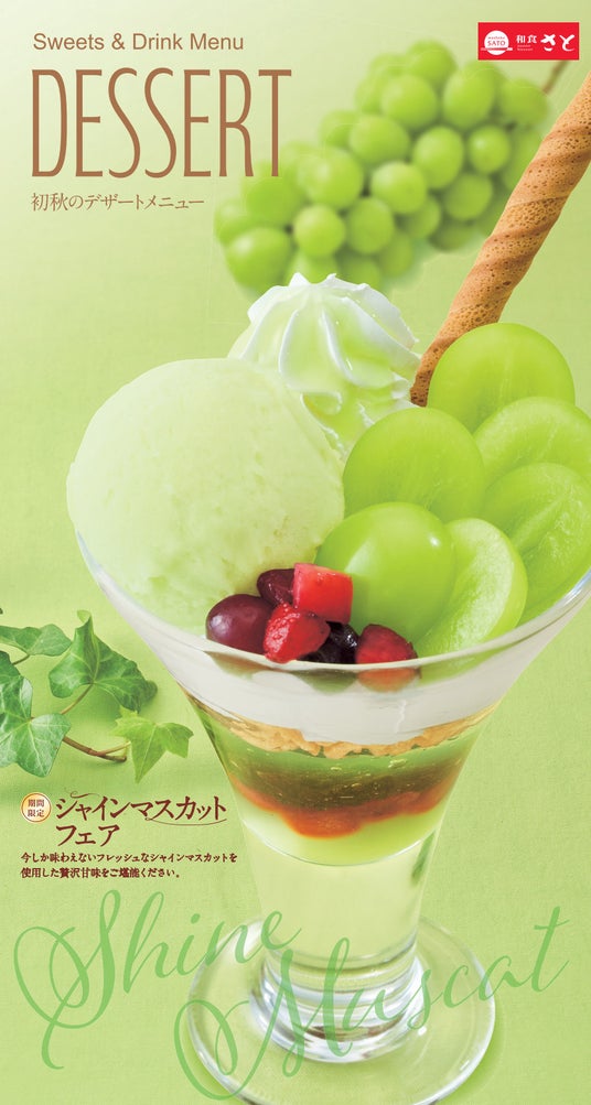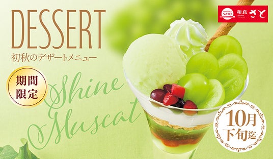 国内197店舗を展開する「和食さと」では、旬のフルーツ「シャインマスカット」を使った季節限定のデザートメニュー9月12日(木)から10月下旬まで期間限定で販売します。