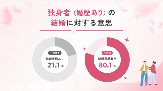 2022年に内閣府が発表した調査報告書によると、40~60代の独身者(婚歴あり)における「結婚意思あり」の割合は21.1%であるのに対し、「ラス恋」の婚歴ありユーザーの80.1%(男性81%・女性78%)が再婚意思を示しており、新しい人生のパートナー探しを希望される多くの方にも「ラス恋」をご利用いただいております。