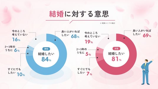 アプリ内の結婚に対する意思の項目では、男性83.5%・女性80.7%と80%以上が結婚を希望し(※)、将来的な関係性を前提としたパートナー探しに対する前向きな姿勢が伺えます。