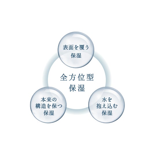 表面を覆う、構造を保つ、水を抱え込むというメカニズムの異なる3つの保湿成分を贅沢に配合。乾燥や肌荒れを防ぎ、健やかな肌に整えます。