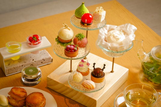 サンタクロースに見立てたベリームースやトナカイのチョコタルト、ピスタチオとキャラメルムースのもみの木、雪の結晶をあしらったバナナケーキなど、心躍るクリスマスのモチーフをちりばめたスイーツがフェスティブムードを高めます。ローストビーフの手毬寿司や赤いビーツを添えたキッシュロレーヌといったシェフこだわりのセイボリーも。店内で焼き上げるオリジナルスコーンには、京都・水尾の柚子と栗を練り込んだクリスマス期間限定フレーバーが登場いたします。ジンジャーやシナモンのフレーバーティーなど 8 種のオリジナルティーセレクションとともに、華やかなティータイムをお過ごしください。