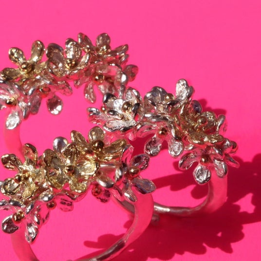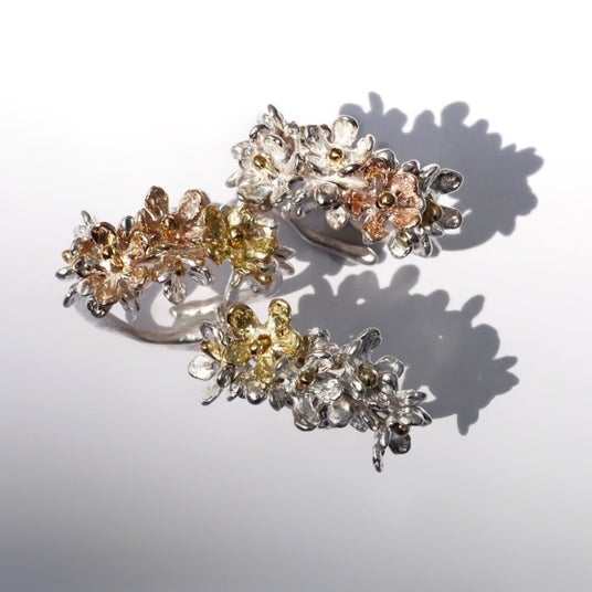 ブランドを代表する紫陽花リングやボタニカルリングと同様、まるで生け花のように、お花をワイヤーでひとつひとつ職人が手作業でつけて制作していくかすみ草。