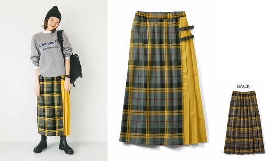 リブ イン コンフォート 人気スタイリスト 石上美津江さんとつくった 巻きスカート風チェックスカート〈グレー×マスタードイエロー〉