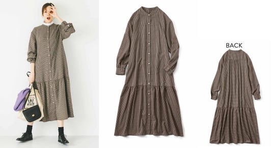 すっきり見えするバンドカラー、プッシュアップして着てもおしゃれなボリューム袖、そしてやや低め位置のティアード切り替え。石上さんが「まさに理想的!」というシルエットのワンピースを、秋感たっぷりなガンクラブチェックでつくりました。エンジ×ブラックのガンクラブチェックの生地は、秋から春まで着られるほどよい厚みが特徴。ボタンはアクセ代わりになってくれるゴールドカラーをセレクト。フリル衿カットソーをインしたり、上からニットベストを重ねても素敵。はおりとしても着られる万能ワンピースです。