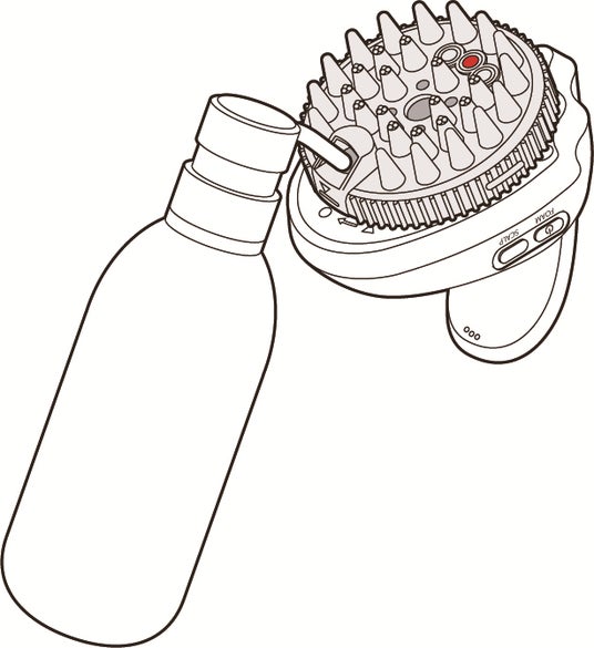 ブラシユニット側を上向きにし、シャンプー液注入口にポンプのノズルを差し込みます。ポンプをプッシュしてシャンプー液を注入してください。髪の長い方は3回、髪の短い方は1、2プッシュで充分な泡が生成できます。タンクに入る容量はプッシュ3回までです。