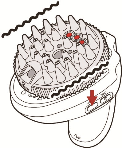 バイブレーションモードにすると本体が細かく振動します。ブラシを地肌にあて、泡が頭皮全体に行きわたるようにゆっくりと滑らせながら、ご使用ください。(もう一度押すと振動が停止します。また、3分で自動停止します。)