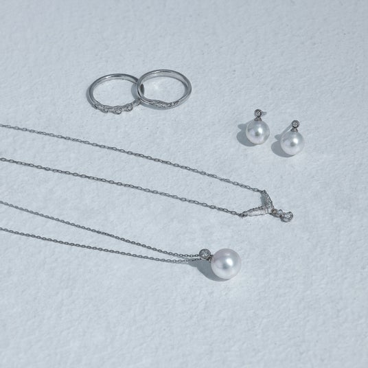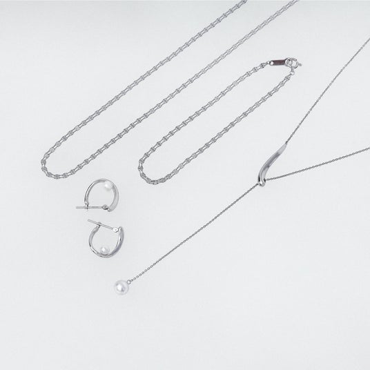 プラチナとアコヤパールのネックレス¥99,000、ピアス¥94,600、チェーンネックレス¥57,200、ブレスレット¥39,600/すべてプラチナ・ウーマン 4℃