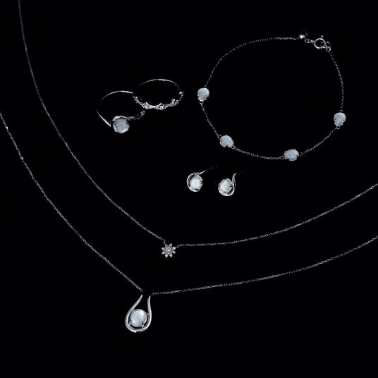 シェル×クォーツのダブレットストーンのネックレス¥103,400、リング¥105,600、ブレスレット¥126,500、ピアス¥73,700、薬指のリング 各¥90,200、星モチーフのネックレス¥66,000/すべて プラチナ・ウーマン ヴァンドーム青山