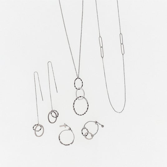 サークルモチーフの3wayペンダント¥145,000、サークルモチーフのリング(右)¥40,000、ピアス¥76,000、トラック型パーツのロングネックレス¥83,000、薬指のリング(左)¥39,000/すべてプラチナ・ウーマン ギンザタナカ