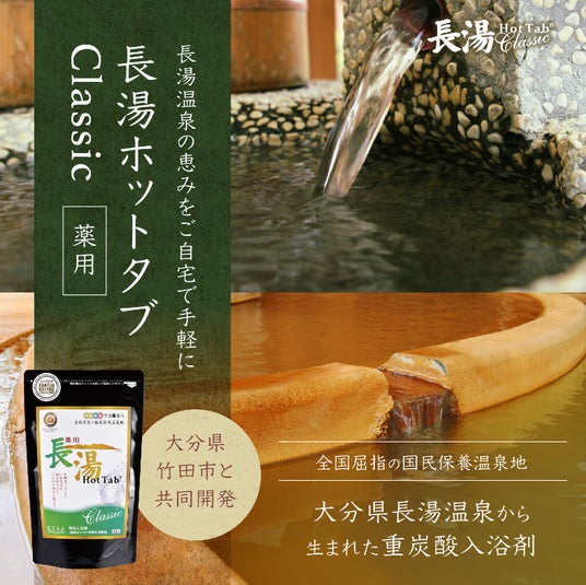 この自然炭酸泉は「中性pHの重炭酸泉」であり、湯中に溶け込んだ「重炭酸イオン」が温浴効果を高めることが分かっています。長湯ホットタブは、重曹とクエン酸を反応させることで「重炭酸イオン」を発生させ、自然炭酸泉のような高い温浴効果をご家庭でもお楽しみいただける入浴剤です。