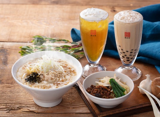 今回新発売される酸菜豆漿鶏湯麺(サンツァイトウジャンジータンメン)はあっさりとした鶏ガラスープをベースに、温かい豆乳にたっぷりの薬味を加え、黒酢の酸味でふるふるの豆乳ともちもち麺を絡めていただきます。シャキシャキの酸菜と高菜、塩味の効いた蒸し鶏のトッピングとごま油の香りが絡みクセになる一品です。また、台湾の春水堂で人気ナンバー1のシグネチャーフードである『功夫麺(クンフーメン)』が小椀サイズで新登場。このレシピはタピオカミルクティーの生みの親であり、今も台湾本社で商品開発を担当している春水堂の“味の番人”リンさんのお母さんの秘伝のレシピです。粗挽き豚肉と椎茸、エシャロットで甘味とコクを加えた肉味噌を絡めました。たっぷり野菜のシャキシャキ食感も楽しめるまぜ麺です。ランチやディナーに春水堂のオリジナルドリンクと共にお楽しみください。