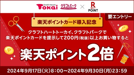藤久株式会社(以下「藤久」)と楽天ペイメント株式会社(以下「楽天ペイメント」)は、藤久が運営する「クラフトハートトーカイ」「クラフトパーク」全店において、2024年9月17日(火)より共通ポイントサービス「楽天ポイントカード」が利用可能になることをお知らせします。本サービスが導入されるのは、手芸専門店業態においては今回が初めてです(注1)。