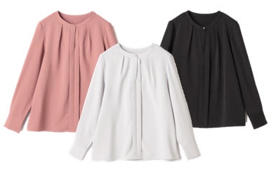 襟元のボタンを開け閉めできる2way仕様とし、1枚で雰囲気を変えて着こなすことができます。裾はインでもアウトでも着やすいようにやや広がりのあるデザインしました。その他にも、首元はインナーが見えない開きにするなど、女性の「ちょっとしたお悩み」が解決できるよう工夫されています。