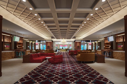 2チャペル・7バンケットを有する日本最大級のゲストハウスにふさわしいメインエントランスは、開港の街・横浜を象徴するように様々な要素をミックスしました。横浜らしさを意識した洋館の佇まいや、歴史を感じさせる豪華客船の丸窓ミラーなどに加えて、遊び心のあるビビッドカラーの装飾や座り心地の良いソファやシーティングを配置。輪が繋がった柄の絨毯は、「Link Ring」という施設コンセプトの通り、人・企業・街との出会いの連鎖が紡ぐ幸せの循環を表現しました。