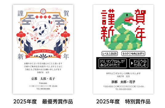 第7回 2025年グラフィック年賀状デザイン公募・受賞作品 最優秀賞と特別賞の2作品の年賀状テンプレート