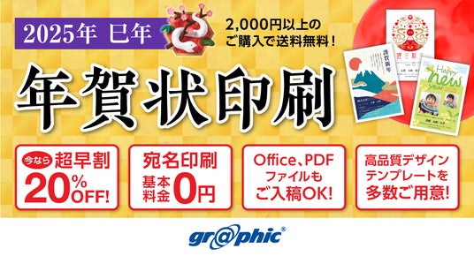 株式会社グラフィック(本社:京都市伏見区、代表取締役社長:西野能央、以下「当社」)はネット印刷事業にて、「年賀状印刷(2025年巳年)」の注文受付を開始しました。年賀状を最大20%OFFで印刷できる、お得な「超早割キャンペーン」を実施中。400点以上の無料デザインテンプレートもご用意しております。