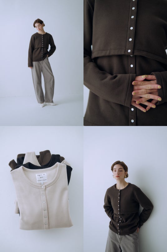 今回のコラボレーションでは、agnes b.のアイコンアイテムであるCARDIGAN PRESSIONSを前後2WAYで着用できる仕様にアップデートしたショート丈カーディガンや、agnes b.が2010年に発表したメンズコレクションモデルを14ボタンのロング丈に仕上げたカーディガンなど全2型ご用意いたしました。