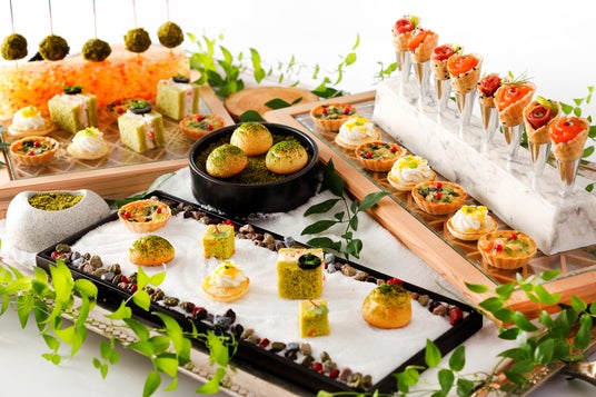 バーカウンターでは、色鮮やかなカクテルやノンアルコールドリンクをご用意。他のゲストに邪魔されないプライベートな空間で、久々に再会する懐かしい仲間と披露宴への期待を胸に、思い思いの時間をお過ごしいただけます。サプライズで新郎新婦が登場するなど、開演前のウェルカムパーティーの場としてもぴったりです。ウェルカムドリンクと一緒に振舞われるのは、披露宴会場から望む日本庭園の景観を思わせる美しいアペリティフの数々。空間と料理で、「ジャパネスクモダン」を感じて。