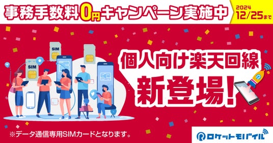 株式会社IoTコンサルティングでは、これまで法人のお客様を対象に提供してきた「格安SIMサービス ロケットモバイル Rプラン(楽天回線)」(以下、本サービス)について、2024年9月13日(金)より個人のお客様からの申し込みを受け付けることと、2024年12月25日まで新規契約事務手数料無料のキャンペーン(以下、本キャンペーン)を実施することをお知らせいたします。