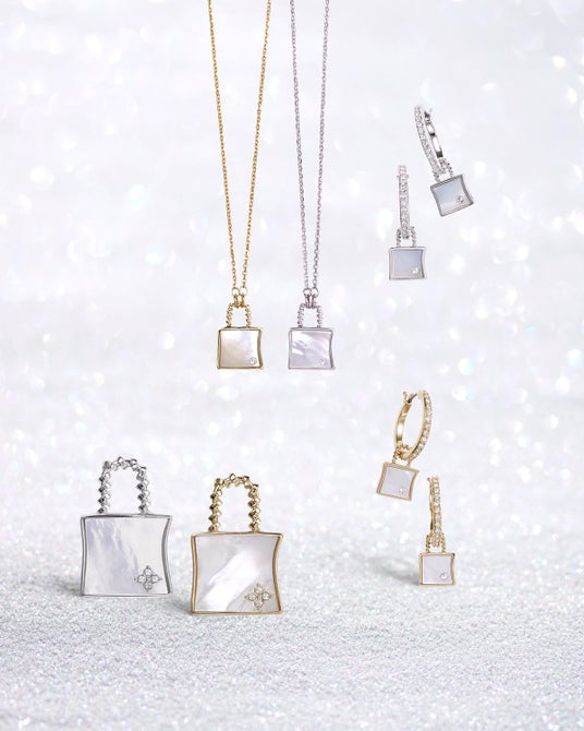 キラキラと輝くワイヤーバッグを白蝶貝で表現したシェルバッグコレクション。優しい白蝶貝の輝きが胸元や顔周りを華やかに彩ります。