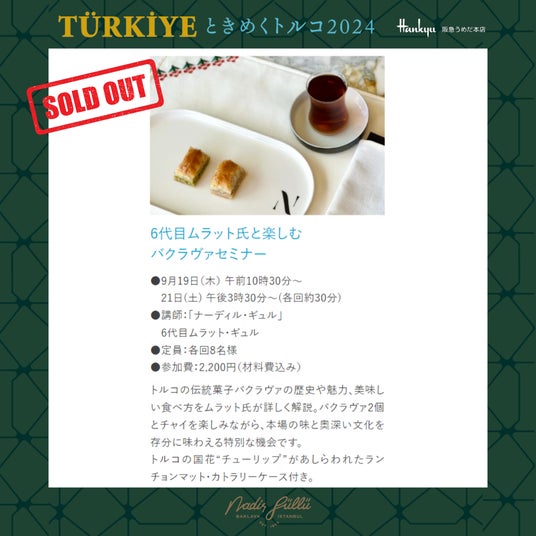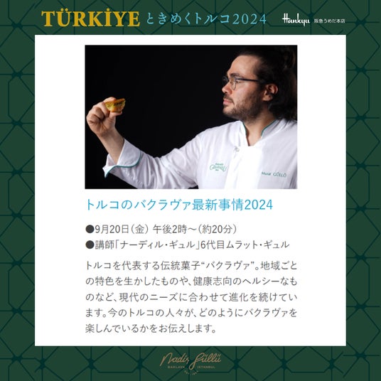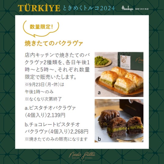 “バクラヴァの王様”と称される、180年の歴史を誇るトルコ・イスタンブールの老舗ブランド「ナーディル・ギュル」の日本総代理店を務める、株式会社エフェトレーディング(東京都港区:代表取締役 安宅 玲奈)は、2024年9月18日(水)から9月23日(月・祝)まで、株式会社阪急阪神百貨店の阪急うめだ本店にて開催されるトルコフェア「ときめくトルコ2024」に出店いたします。