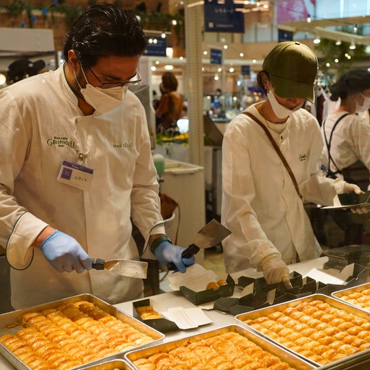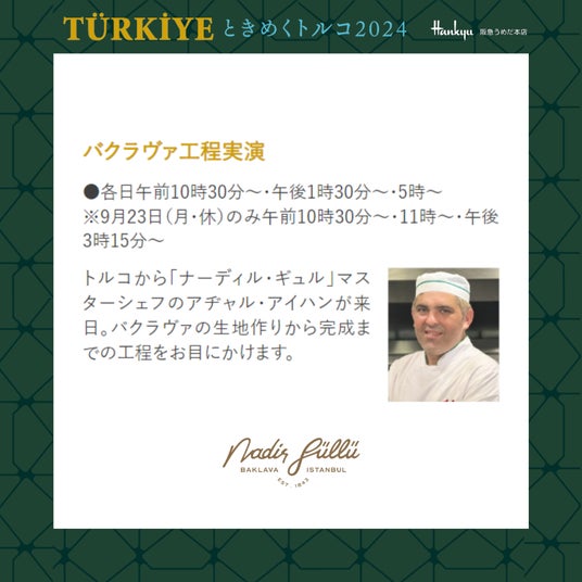 トルコ・イスタンブールより、「ナーディル・ギュル」創業家6代目CEO ムラット・ギュル氏、マスターシェフ アイハン氏が来日し、普段日本でなかなか見ることのできないバクラヴァ作りのデモンストレーションを、2023年9月18日(水)から阪急うめだ本店にて開催される「ときめくトルコ2024」にて毎日実演披露!