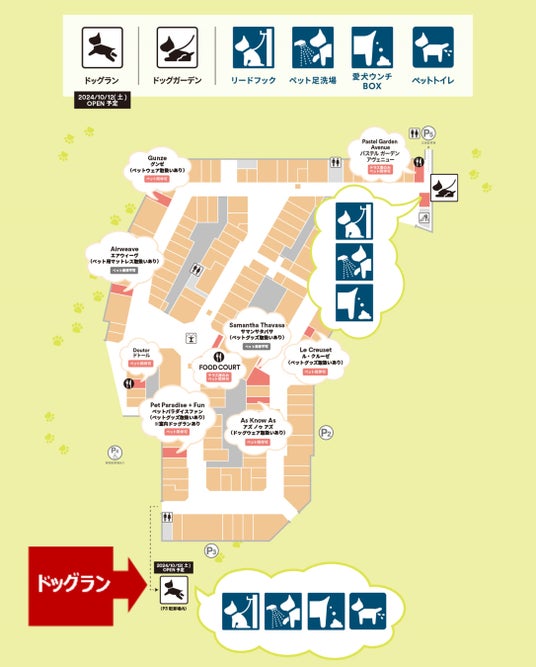 土岐プレミアム・アウトレットは、約80店舗でペットの入店が可能で(店舗により条件あり)、リードフック、足洗い場、愛犬ウンチBOXを設置したミニエリア「ドッグガーデン」も備えています。今回新たにオープンするドッグランによって、よりペットとのご来場が楽しめるペットフレンドリーな施設を目指していきます。