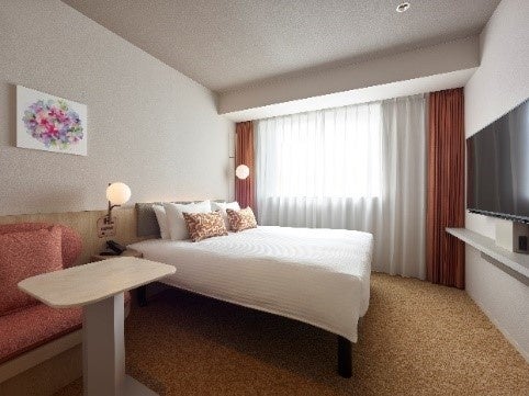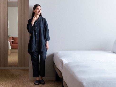 客室のデザインコンセプトは「LIFE COCOON」とし、柔らかな繭に包まれるような空間に仕立てました。優しい色と形で構成され、ストレスがなく、飽きのこない明るいデザインを採用。共用部のグリーンとつながりを感じさせる木調の家具、伝統工芸品の有松絞「suzusan」を纏い柔らかな光を放つランプシェード、フラワーアートなどにより、安らぎのある時間を提供します。フラワーアートは、2・3階を「始まり・芽吹き」、4階は「成長・楽しみ」など、繋がりのあるテーマをフロアごとに設定し、訪れる度に異なるアート作品を楽しむことができます。そのほか、木製の客室備品やヨーロッパでヴィーガン認証を取得しているインバスアメニティ、バイオマス素材を使用したアメニティなどを採用することで、環境に配慮した取り組みに力を入れています。また、従来品よりも柔らかく、肌触りの良い生地を採用し、デザイン性にこだわった新仕様のナイトウェアを導入しました。