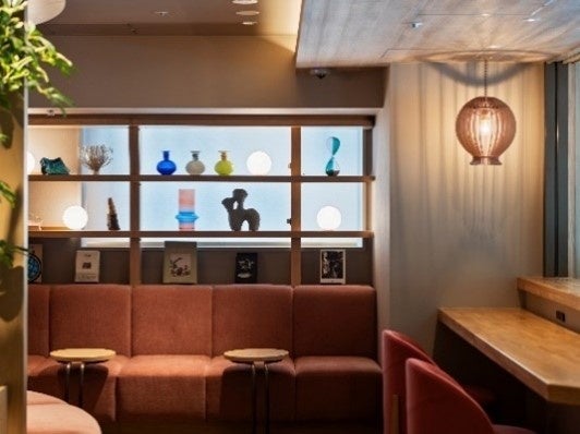 2階のリフレッシュスペースは「TREE HOUSE」をイメージし、緑豊かなロビーを見渡すことができる空間が特長です。ハイカウンターとソファ、趣の異なる2つのエリアで構成されたスペースには、暖色系の間接照明などを採り入れ、リサイクルガラスの花器やアップサイクルのレザーフラワーなど、サステナブルを表現したアート作品を展示。 さらに、自然や地域をキーワードに、植物図鑑や築地市場に関する書籍を揃えました。