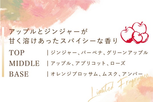 アップルとジンジャーが甘く溶け合ったスパイシーな香りトップには、キーとなるジンジャーとグリーンアップル、そして柑橘のような清潔感のあるバーベナを調香。