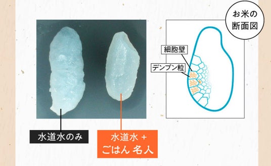 ミネラル(マグネシウム)がお米の細胞壁に付着し、炊飯時に米粒の組織が壊れることを防ぎます。 その結果、お米の旨味や水分を閉じ込め、ごはんがふっくらつややかに炊きあがります。