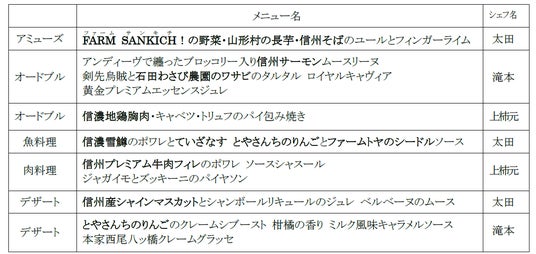 シェフが牧場や農園などの生産地を視察し、実際に食材を手に取り、味を確かめ、長野県の美しい風土を活かした飼育と栽培、「おいしさ」を裏付けるこだわりを生産者から直に聞き、メニューを考案。生産者への敬意と食材への理解を深めたシェフが、この日のために腕を振るう、美食の饗宴をご堪能ください。