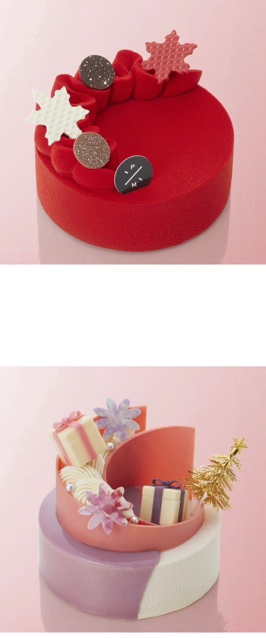 クリスマスを華やかに彩る、つややかなルージュのカラーが目を引くケーキ。ホワイトチョコレートで仕立てたいちごクリームとコクのあるピスタチオクリームをたっぷり使用し、サクッと軽やかな食感のヘーゼルナッツのサブレを重ねています。