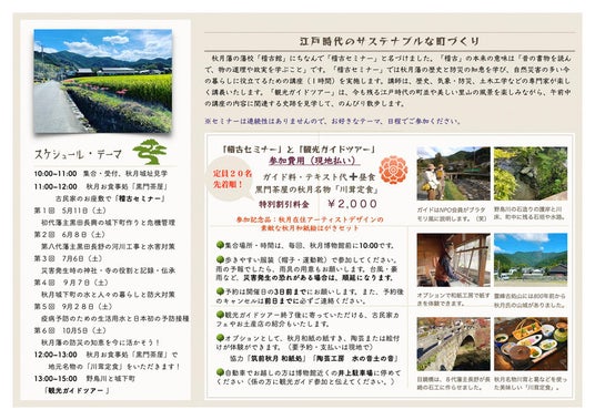 秋月観光は桜と紅葉だけではありません。藩成立400年を迎えた黒田氏秋月藩の史跡が数多くあり、城下町の町割りや伝統的建造物、今も残る「防衛・防災・防火」の仕組み(町割、石造りの護岸・川床・水路)なども見ることができます。楽しく秋月を観光しながら、現代の防災にも役立つ「秋月藩の命を守る知恵」を学びませんか。