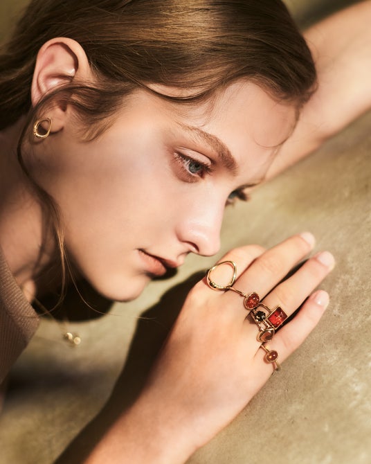 こっくりとした深みのあるカラーのジュエリーで、柔らかく落ち着いた雰囲気の秋のスタイリングを提案します。