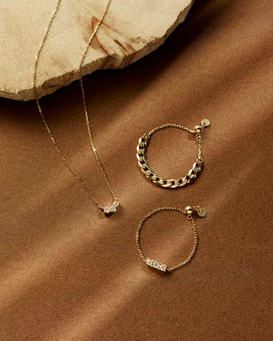 チェーンからダイヤモンドがこぼれ落ちる様なデザインの限定ネックレス。3石を小さな爪でぎゅっと寄せて留めることで、輝きを存分に楽しめる仕上がりに。お揃いのチェーンリングもラインナップします。喜平チェーンのリングは表面にカットが施され、上品な煌めきが魅力。どんなリングとも相性が良いので、お手持ちのリングとの重ね着けを楽しんで。