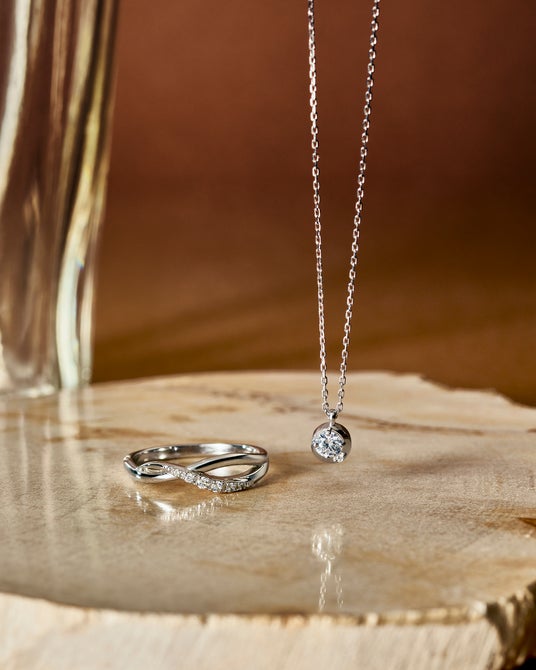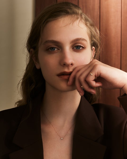 高い精度でシンメトリーにカットされることによって8本の矢と8個のハートが映し出される「ハート&キューピッド」のキュービックジルコニアをあしらった限定ネックレス。大ぶりな石が動くたびきらめき、胸元で存在感を放ちます。キュービックジルコニアは石枠の中心より少しずらしてセッティングし、小さい中に奥行きを感じさせるデザインに。