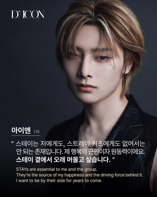 「STAYは僕にとっても、Stray Kidsにとってもいなくてはならない存在です。僕の幸せの源であり、原動力なんです。 STAYのそばに長くいられたらと思います」(I.N)