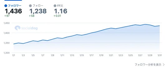 ダッシュボードで連携したXアカウントの「フォロワー数」「フォロー数」「FF比(フォロワー数÷フォロー数で計算される比率)」 の推移のデータをグラフで確認できます。
