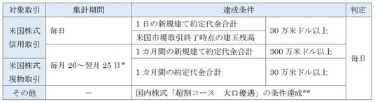 – 楽天証券 「米国株大口優遇サービス」の達成条件以下のいずれかを達成すると、3カ月間、「米国株大口優遇サービス」の対象になります。