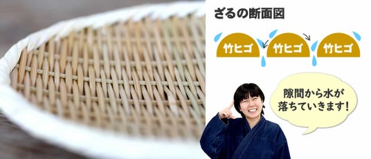 熟練の職人が一本一本手作業で丁寧に編み上げた丸竹ざるは、カマボコ状に削られた厚みのある竹ひごを使用し、水切れの良さと丈夫さを兼ね備えた構造が特徴です。竹ひごの編み込みには、特殊なネジリ加工が施されており、長期間使用しても形崩れしません。また、籐巻きによる縁巻きも、しっかりとした作りで竹ざるの耐久性をさらに高めています。