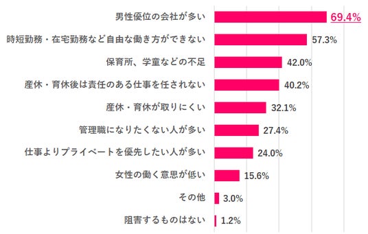 女性の活躍を阻害している要因を聞いたところ「男性優位の会社が多い」69.4%が最も多い結果となり、次いで「時短勤務・在宅勤務など自由な働き方ができない」57.3%、「保育所、学童などの不足」42.0%と続きました。