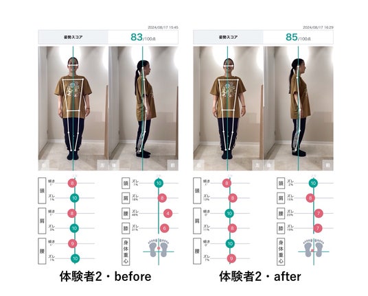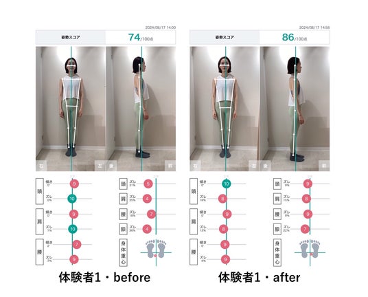 AIで姿勢の左右差やゆがみを数値化できるアプリ「ボディアライメント(https://body-alignment.com/)」を使用し、初回体験時に姿勢スコアを計測。1回のプログラム体験で姿勢改善の効果を実感いただけます。