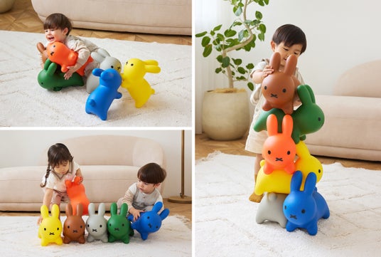くみくみうさぎは、ディック・ブルーナさんが描く絵本の世界に登場する動物の「うさぎ」がモチーフ。ブルーナさんの絵本はオリジナルの赤、青、緑、黄、グレー、茶の6色+黒で基本構成されています。この6色は絵本作家だけでなくグラフィックデザイナーとして世界的に活躍したブルーナさんが、長い時間をかけて作った特別な色で、ブルーナカラーと呼ばれています。ここ数年、ファッションをはじめインテリア等で流行しているくすみカラーを取り入れたおもちゃも目にする機会が増えましたが、「ブルーナボンボン くみくみ」には、長年愛され続けるブルーナカラーが使われています。